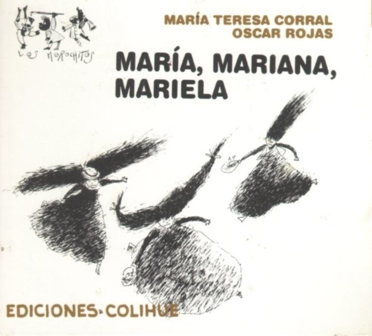 Una canción de tres niñas para imaginarse la música. Pequeños poemitas en imprenta mayúscula desplegados verso a verso entre ilustraciones en blanco y negro.